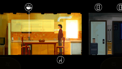 2、 进入初始剧情后,操作很简单:屏幕按住左下角是向左走,按住右下角是向右走;此时我们向左走进房子里,点击屏幕上的“爱心”图标,之后再次进入房子,点击两次“时间钟表”图标,触发剧情推进;